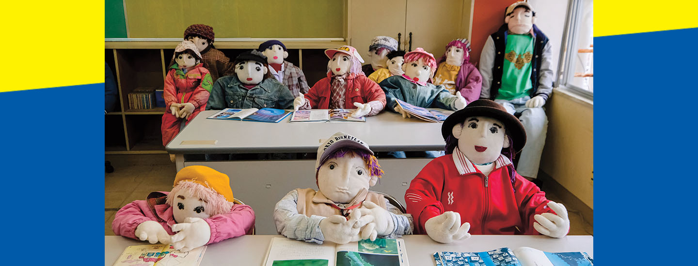 Dolls sit in a classroom in Nagoro, Japan. Not a single baby has been born in the village in two decades.